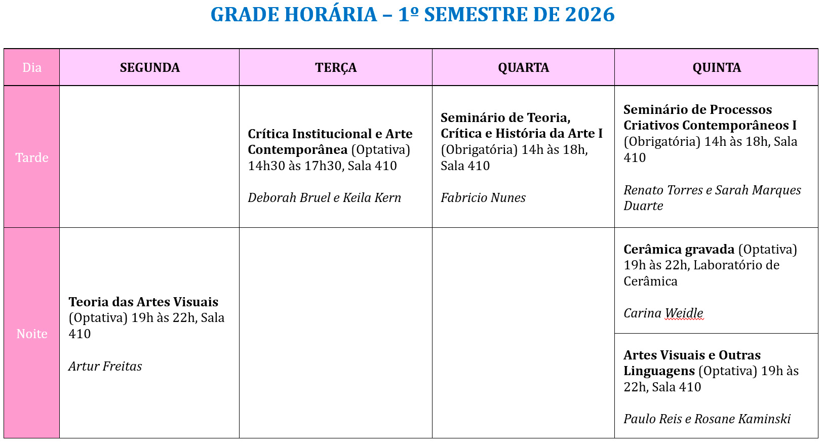 O PPGAV divulga abaixo o Edital com as instruções relativas à confirmação de matrícula dos novos alunos (candidatos aprovados para a Turma de 2026) do Mestrado em Artes Visuais. A confirmação de matrícula é obrigatória para os novos alunos e ocorrerá entre 02 e 13 de fevereiro de 2026. A não-confirmação de matrícula implicará a perda da vaga como aluno regular no PPGAV.